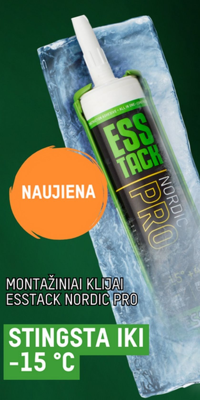 Todėl ESSVE pasiūlė sprendimą – labai stiprius ir greitai kietėjančius montažinius klijus „ESSTACK Nordic Pro“, kurie ne tik turi didelę pirminę sukibimo jėgą, bet ir gali būti naudojami šaltu oru – išbandyta iki minus 15 laipsnių šalčio. Net ir esant šalčiui, klijai lengvai išspaudžiami iš talpos. Jie yra šiek tiek elastingi, pagaminti be tirpiklių ir bekvapiai.