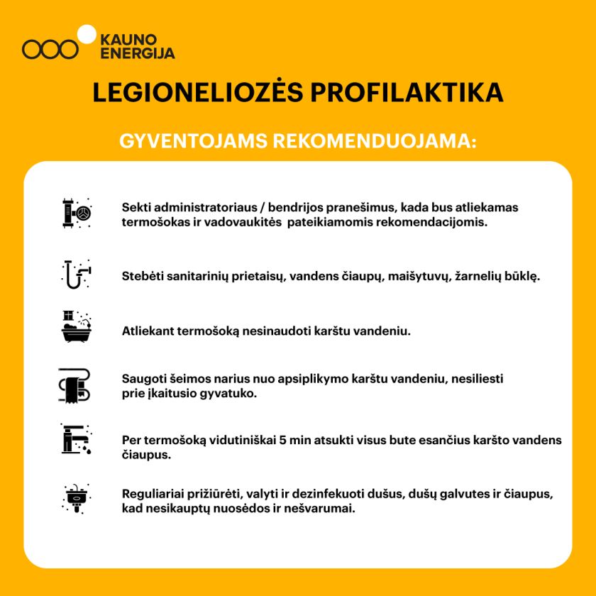Centralizuotai miesto šilumą ir karštą vandenį Kauno mieste ir rajone bei Jurbarke tiekianti bendrovė „Kauno energija“ nuo balandžio 15 d. 00.00 val. iki balandžio 17 d. 00.00 val. termofikacinio vandens temperatūrą padidins iki 80 °C, kad pastatų karšto vandens sistemų prižiūrėtojai arba administratoriai galėtų atlikti terminę legioneliozės prevenciją – terminę dezinfekciją (termošoką).