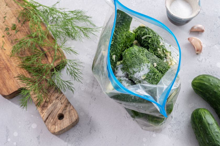 - Į agurkus sudėkite visus paruoštus ingredientus, taip pat garstyčių sėklas. Juos tolygiai pabarstykite druska ir įpilkite vos šlakelį aliejaus bei šiek tiek acto. Tuomet iš maišelio išspauskite orą, uždarykite ir švelniai pakratykite agurkus, kad prieskoniai tolygiai pasiskirstytų.