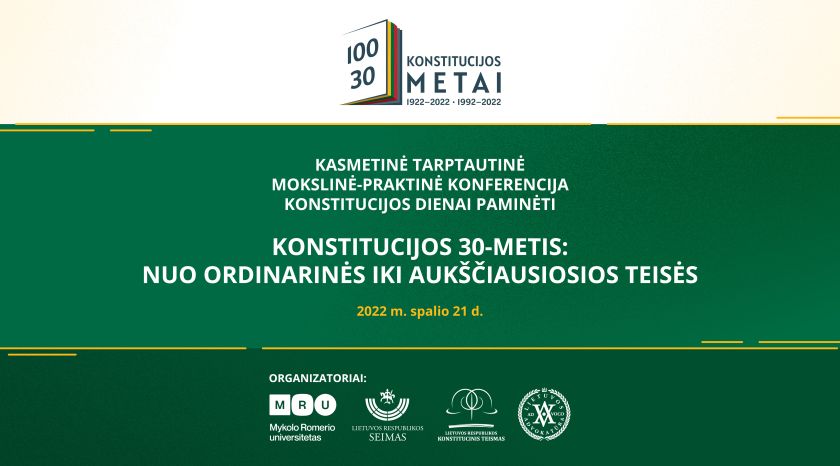 2022 metų spalį sukanka 30 metų, kai buvo priimta Lietuvos Respublikos Konstitucija. Spalio 21 dieną, Lietuvos Respublikos Seime rengiama tarptautinė, jau dešimtoji, mokslinė-praktinė konferencija „Konstitucijos 30-metis: nuo ordinarinės iki aukščiausiosios teisės“. Konferencijoje sveikinimo žodį tars J. E. Lietuvos Respublikos Prezidentas Gitanas Nausėda, Seimo Pirmininkė Viktorija Čmilytė-Nielsen, Mykolo Romerio universiteto rektorė prof. dr. Inga Žalėnienė. Konferencijos pirmąjį pranešimą, skirtą jubiliejiniams Konstitucijos metams, skaitys J. E. Latvijos Respublikos Prezidentas, Mykolo Romerio Universiteto Garbės daktaras Dr. iur. h. c. Egils Levits. Konferencijos dalyviai iš Estijos ir Lenkijos pristatys šių šalių naujausias konstitucinės justicijos tendencijas. Karo iššūkių Ukrainos Konstitucijai temą atskleis pranešėjas iš Ukrainos. Trijų dalių konferencijos programoje iškilūs Lietuvos pranešėjai kalbės apie konstitucinės…